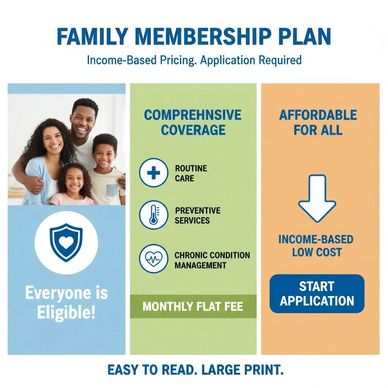 Covers household members with access to routine care, sick visits, preventive services, and chronic condition management. Monthly cost is determined based on income eligibility.