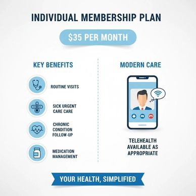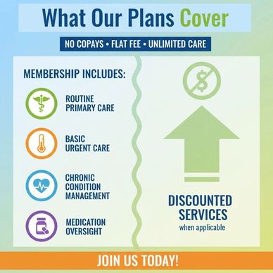 Membership provides access to routine primary care, sick visits, basic urgent care, chronic condition management, and medication oversight. Members may also receive discounted services when applicable.